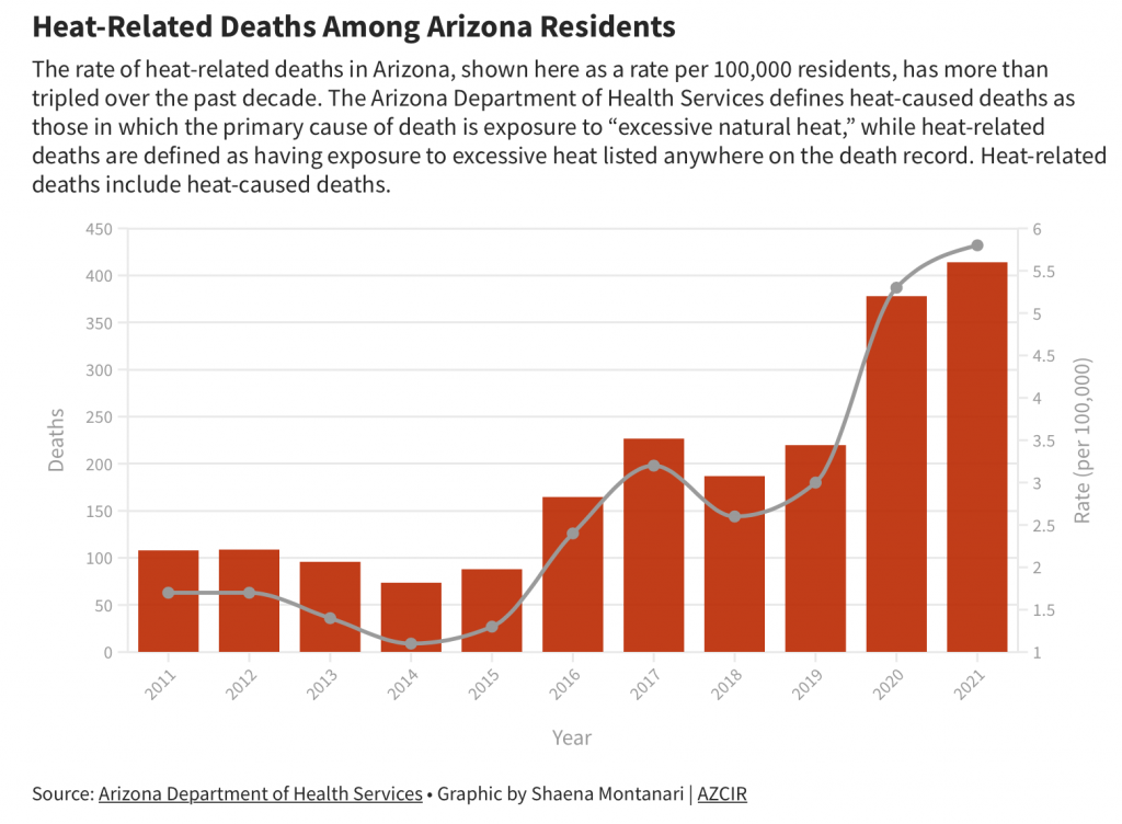 The rate of deaths related to heat in Arizona has more than tripled over the past decade. In 2021, 414 Arizona residents died from a heat-caused or heat-related illness. When counting non-Arizona residents, the death toll jumped to 552.