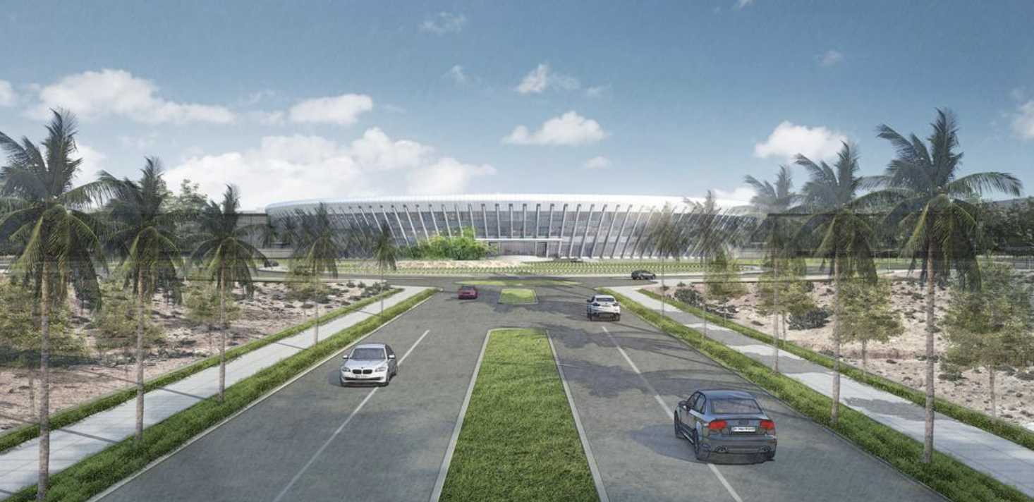 While the Taiwan-based company hasn’t released images of the factory building itself, it has released images of a circular-shaped office building currently under construction. A second rendering shows a roadway leading to the office and main entrance of the campus.