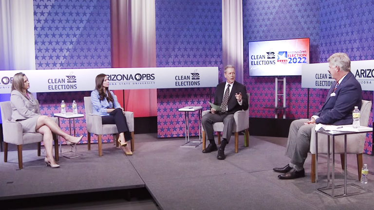 State Rep. Shawnna Bolick, state Sen. Michelle Ugenti Rita, Arizona PBS host Ted Simons and Beau Lane at a June 15, 2022 candidate debate in