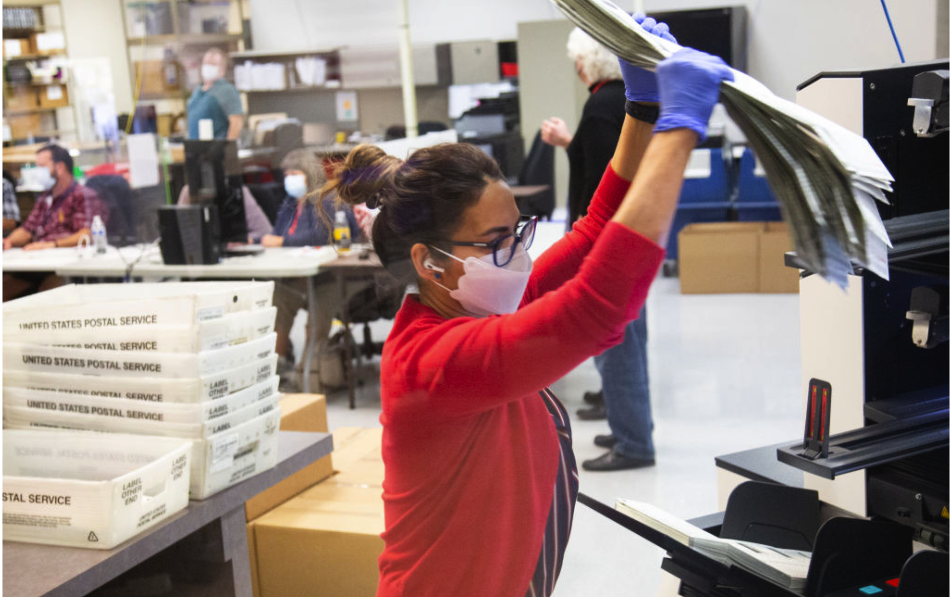 Votes are counted by staff at the Maricopa County Elections Department office on Nov. 5, 2020. /Photo by Courtney Pedroza / Getty Images
