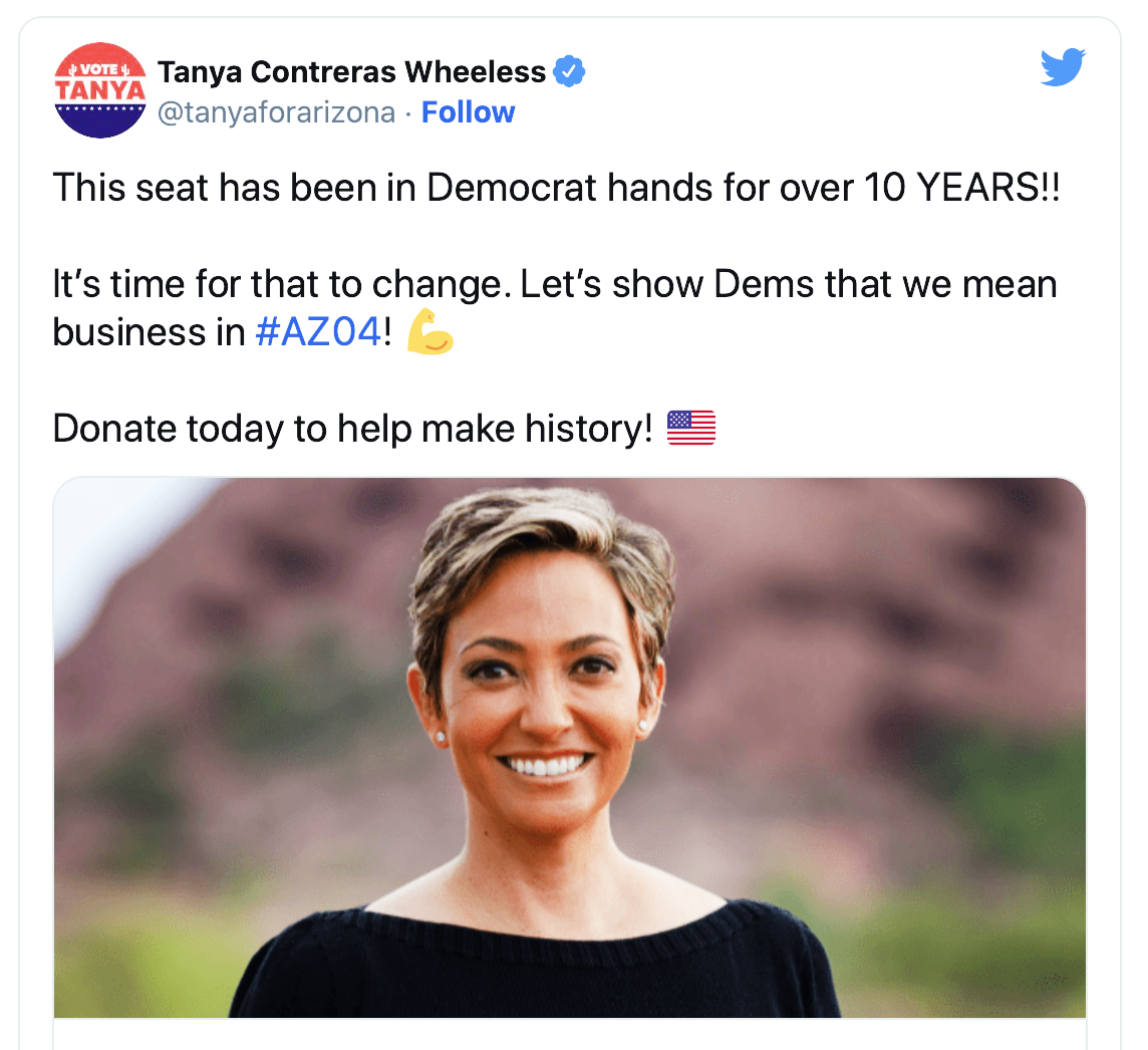 Wheeless, a former president and CEO of the Arizona Bankers Association and a deputy chief of staff to former U.S. Sen. Martha McSally, R-Ariz., touts her Republican credentials on her website and uses Democrats in office to fundraise on Twitter. Yet, she contributed to five Democratic campaigns between 2004 and 2012, one twice, with no donation under $250.