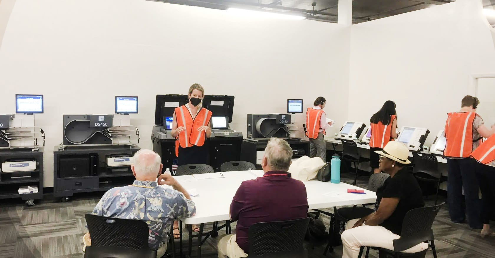 The secretary’s staff wore orange vests to distinguish them from others in the room. Legally required observers for the local Democrats, Republicans, and Libertarians wore lanyards in colors associated with their parties. A table stacked with waters and sweet treats sat near the stars of the show: the county’s voting machines and tabulators.