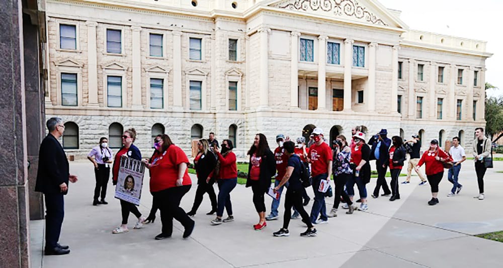 Supporters of raising the aggregate expenditure limit for education march into the Senate building in February. Senate Minority Leader Rebecca Rios said the Red for Ed movement was the most “significant, poignant, episode” she has run across while in the Legislature. /Photo by Camryn Sanchez/Arizona Capitol Times
