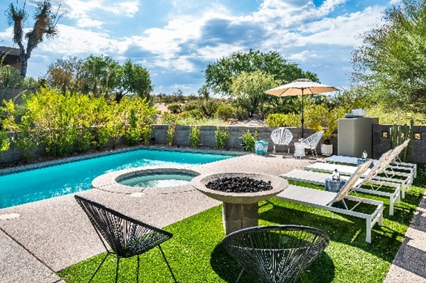 Lastly, you can bring the gathering out to the back yard which contains an outdoor living room with a plush couch and club chairs as well as a TV for watching your favorite show in the cool evening air, or you can head to the fire pit to warm up some. Misters cool the room down in the summer, but you can also take a dip in the pool to beat the heat.