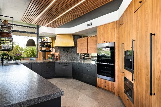 “While this house was designed nearly 30 years ago, it stands as a testament to the timelessness of organic architecture. Taking the principles I learned from my time as an apprentice at Taliesin, I designed this house with modern simplicity in mind,” said Hu.“The house combines classicism and modernity, with clean lines and a material palette that fits the surrounding desert landscape. The pitched roof form creates visual interest in the interior spaces and is complemented by deep covered porches that provide necessary protection from the scorching desert sun. The reimagined interiors elevate the home to provide luxurious finishes while still allowing the original architecture to shine.”