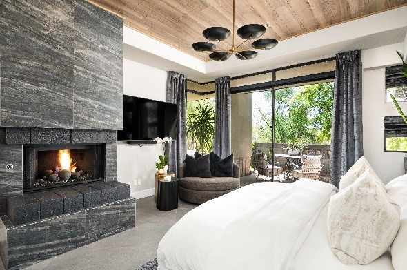 Starting in the primary bedroom, a double door entry gives a grand entry, with Berkley solid core doors with solid handles that are soft to the touch. The closet has solid double pocket doors that open up to a two-person closet. It features a fireplace filled with black glass, a circular swiveling soft seat and a mid-century modern chandelier; comfort intersects with class. The shower was extended and lit with LED lighting in the shower and under the vanity. As is a common theme, everything was custom made.