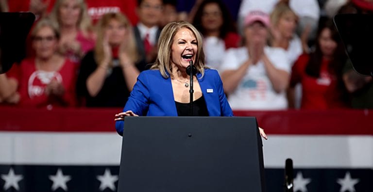 State GOP chair Kelli Ward speaks with supporters of former President Donald Trump at a “Keep America Great” rally at Arizona Veterans Memorial Coliseum in