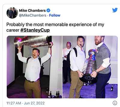 The post shows photos of Chambers holding the Stanley Cup trophy with a cigar in his mouth and beer bottles visible on the floor next to him. Above the photos, Chambers wrote, “Probably the most memorable experience of my career #StanleyCup.”