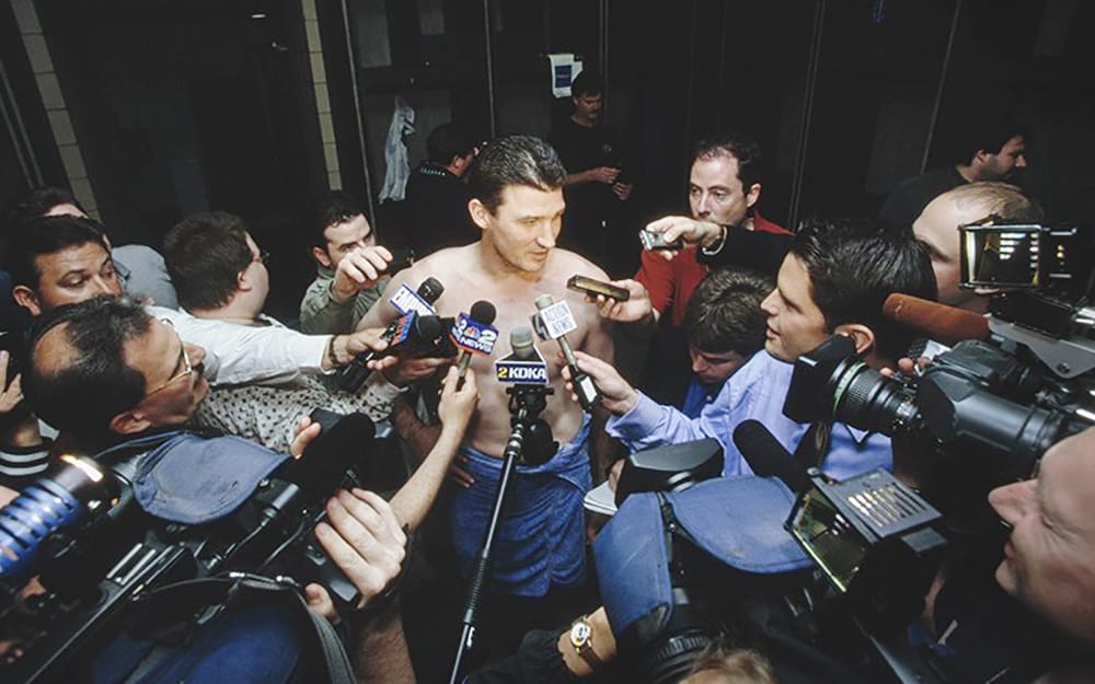 Longtime sports journalists, like these reporters covering Pittsburgh’s Mario Lemieux in 2001, were taught to report only the facts, but the advent of social media has revealed a fandom side of media, too. /Photo by Rick Stewart/Allsport/Getty Images