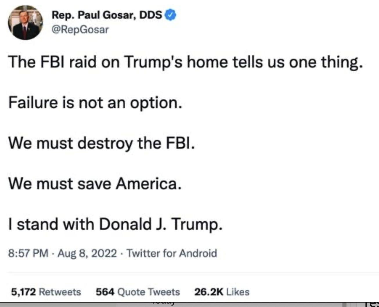 In five lines of text, Gosar, R-Ariz., invalidated a federal investigation, professed his continued alliance with Trump and called for the destruction of the FBI.