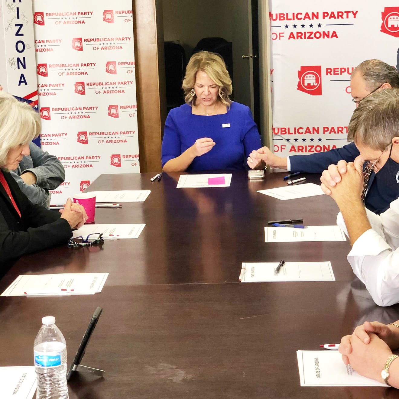 A photo posted on Twitter by the Republican Party of Arizona showed the electors sitting in prayer before casting their votes for Donald Trump on Dec. 14, 2020.