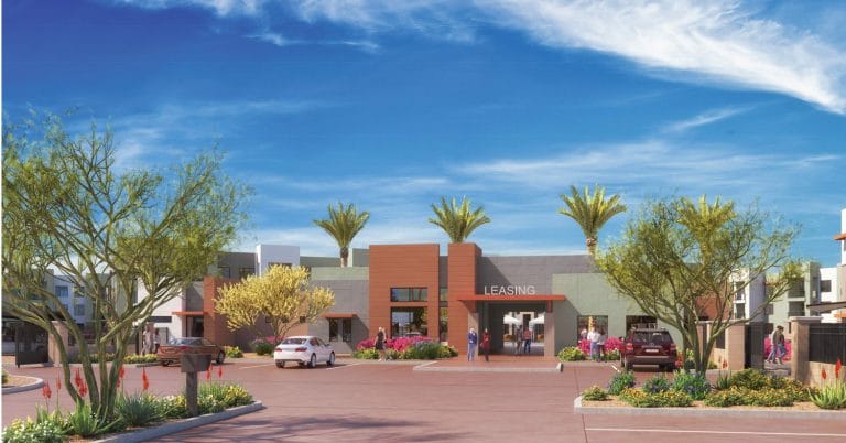 An artist’s rendering of the clubhouse and leasing office of the proposed family apartment community at Truman Ranch Marketplace, on the corner of Waddell Road