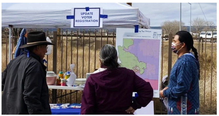 Volunteers with Northeast Arizona Native Democrats talk with potential Native voters in Window Rock, Arizona, about the congressional and legislative map redistricting. || Photo courtesy