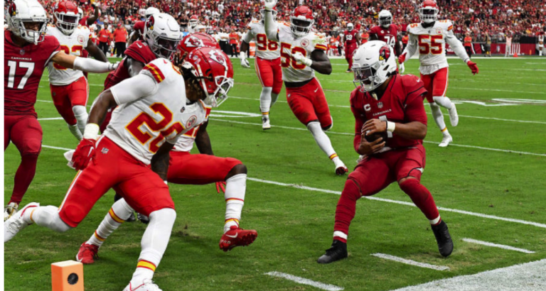 Quarterback Kyler Murray #1 of the Arizona Cardinals runs with the ball as safety Justin Reid #20 of the Kansas City Chiefs closes in during