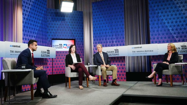 Attorney General candidates Republican Abe Hamadeh and Democrat Kris Mayes meet for a debate at the Arizona PBS studio on Wednesday, Sept. 28, 2022. By