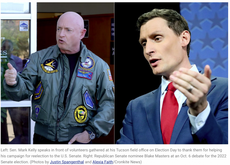 Left: Sen. Mark Kelly speaks in front of volunteers gathered at his Tucson field office on Election Day to thank them for helping his campaign