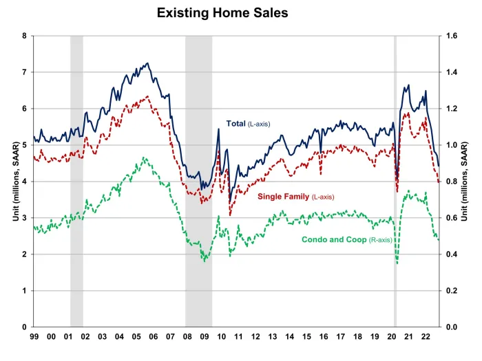 Total existing home sales, including single-family homes, townhomes, condominiums and co-ops, fell 5.9% to a seasonally adjusted annual rate of 4.43 million in October, the lowest pace since December 2011 with the exception of April and May 2020. On a year-over-year basis, sales were 28.4% lower than a year ago.