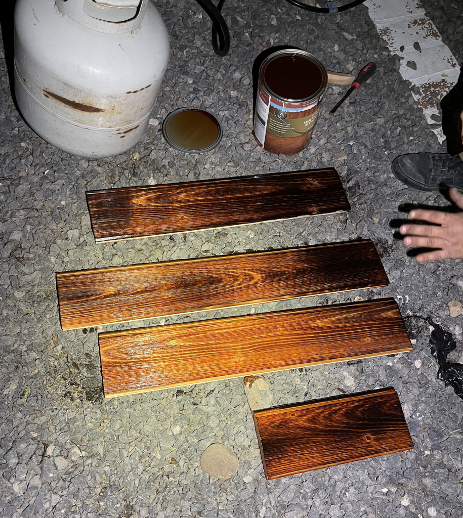 “We set it on the ground and created an assembly line. We scraped the wood, torch it, scrape again with a metal brush to remove any and then we seal it with oil,” said Henry. The method makes the home resistant to insects, rot and decay for decades, regardless of how heavy it’s scorched. Styles can range from slightly crisped to looking like black alligator skin.