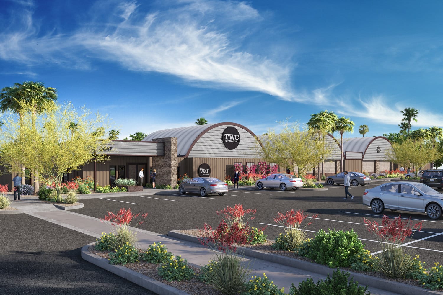 An industrial business will repair construction equipment beneath arched canopies and repurposed shipping containers south of State Route 24 Gateway Freeway on the east side of Mountain Road in Mesa.