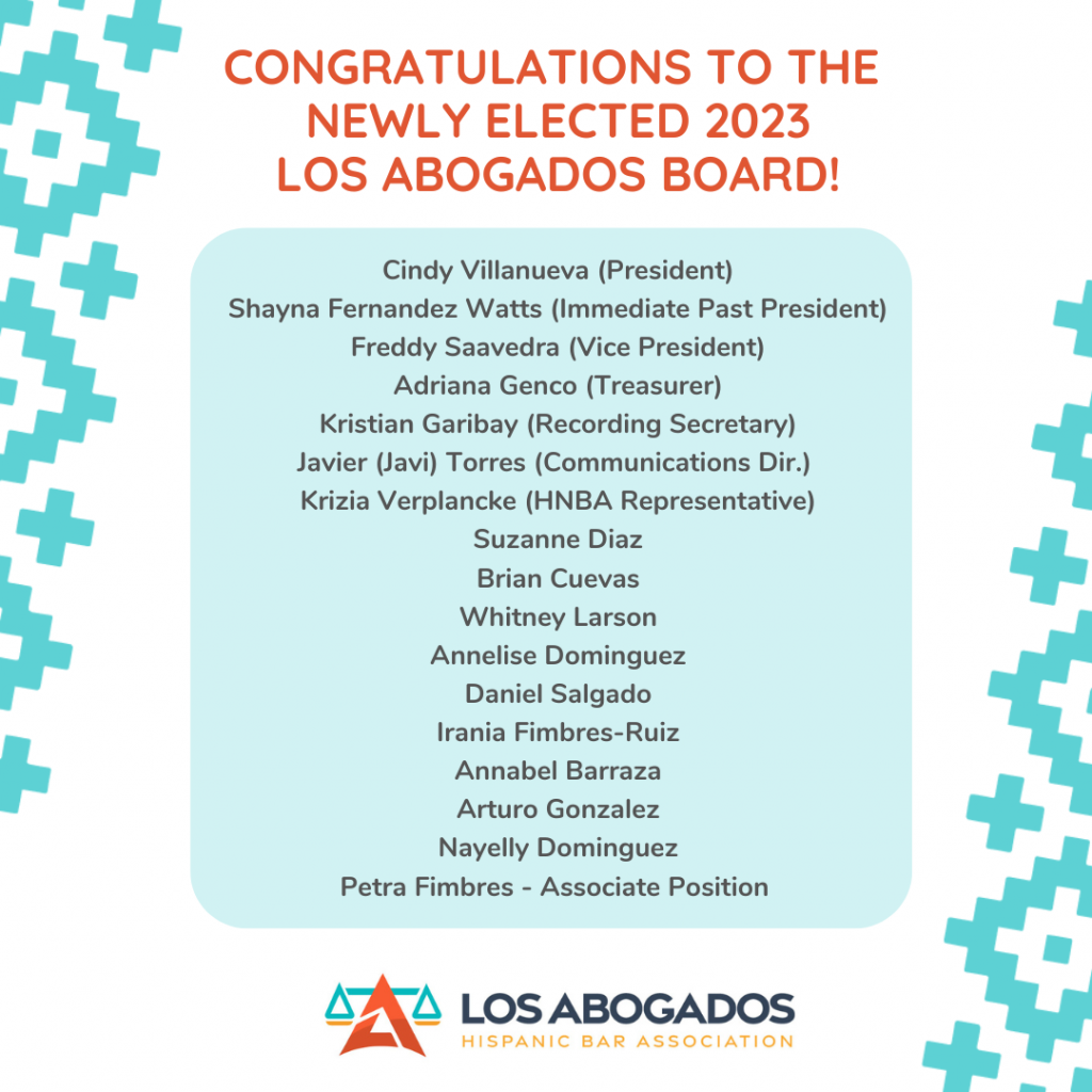 “I am excited to continue serving on the Board of Directors of Los Abogados Hispanic Bar Association. The Board stays committed to its goal of empowering and supporting the Latino community through the advancement of the legal profession. I am grateful for the opportunity to be a part of this mission,” Cuevas said.