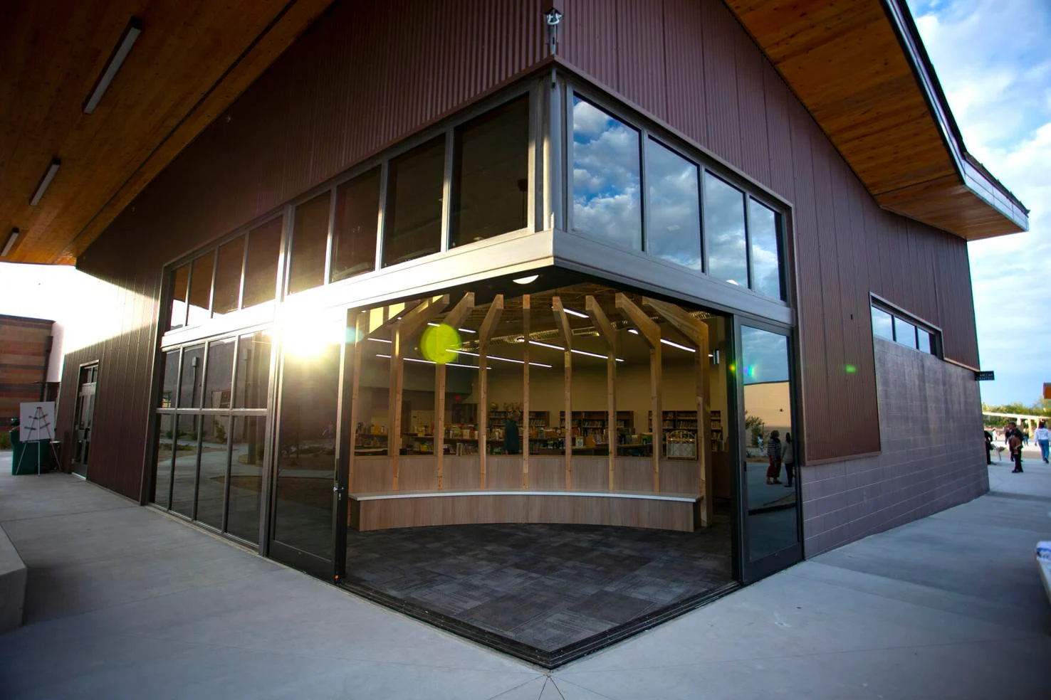 A corner of the school library opens to the outside to create an open-air reading area at Kiva Elementary. (David Minton/Staff Photographer)