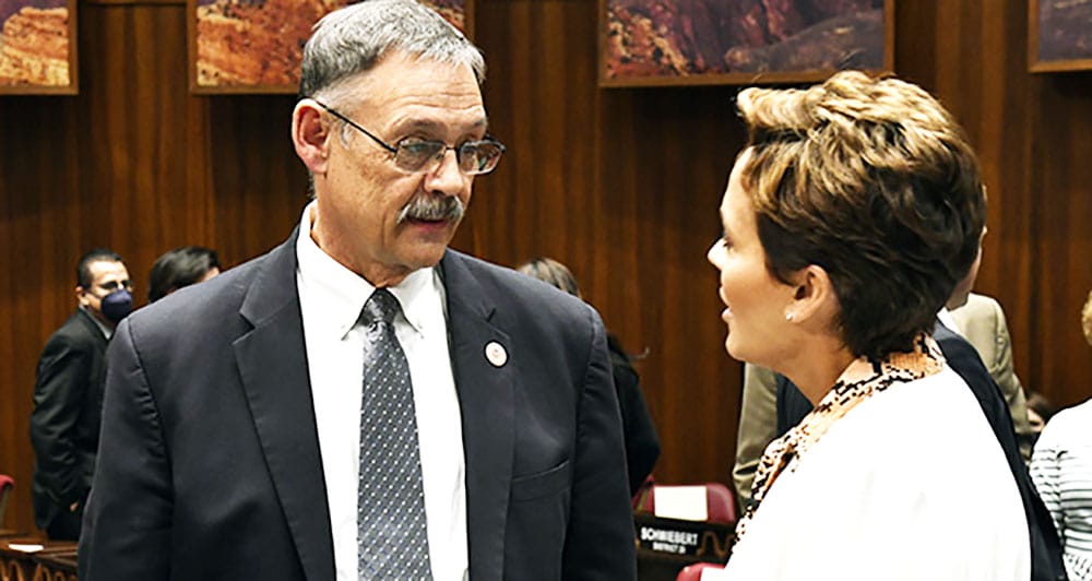 Rep. Mark Finchem, R-Oro Valley, and Kari Lake confer earlier this year on the House floor. A federal judge ordered sanctions against attorneys representing failed Republican candidates Finchem and Lake in their lawsuit against the Secretary of State and Maricopa County that sought to ban the use of electronic vote tabulators and force a hand count of ballots. || Capitol Media Services file photo by Howard Fischer