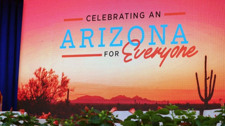 A video board displays Gov. Katie Hobbs’ message of unity at a public swearing in ceremony on Jan. 5, 2023. Photo by Jerod MacDonald-Evoy ||