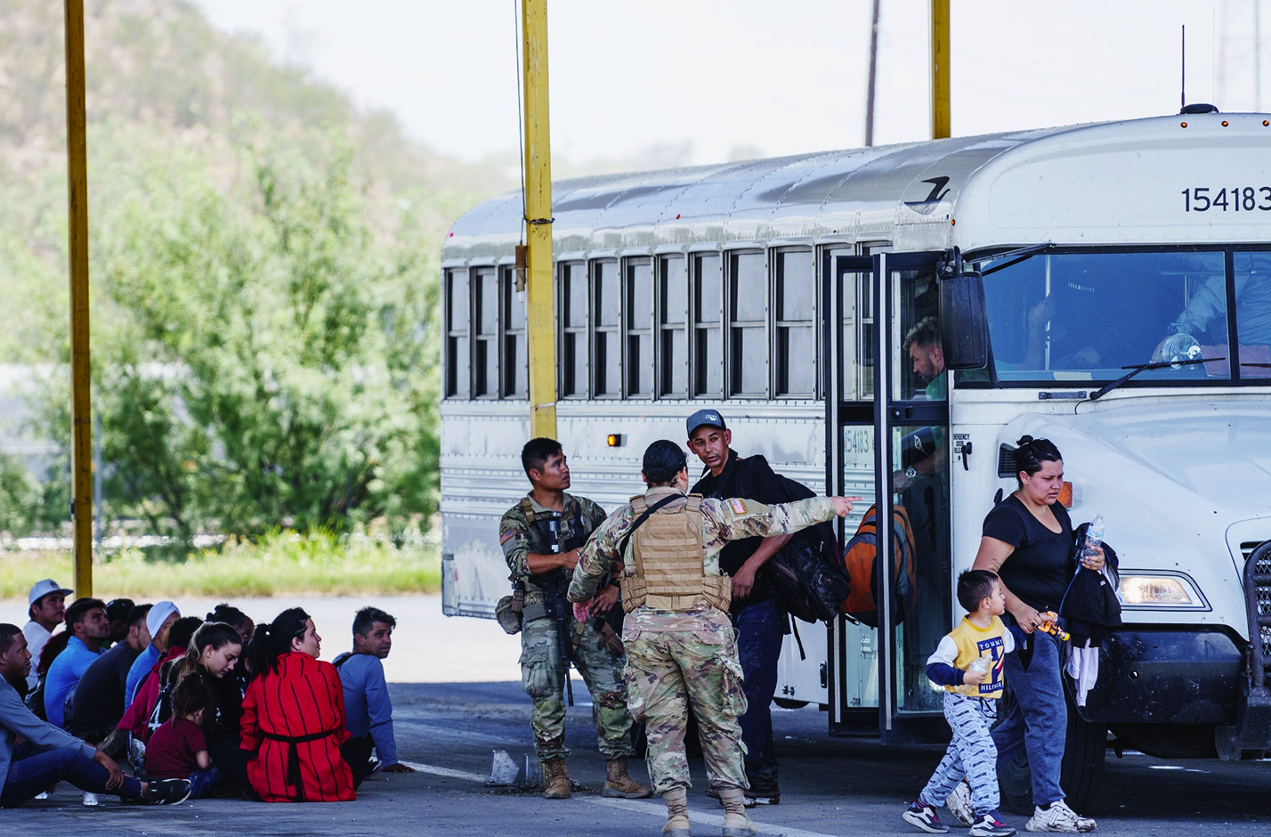 Members of the Texas National Guard direct migrants exiting from a Texas Department of Criminal Justice bus at the Eagle Pass Commercial Port of Entry to || BY PAUL RATJE/BLOOMBERG/GETTY IMAGES