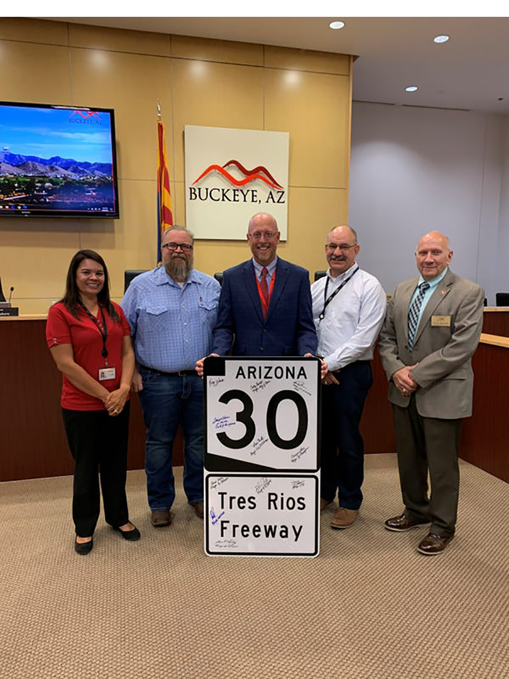 Buckeye City Council celebrates the inclusion of State Route 30 extending into Buckeye as part of the transportation tax headed to voters in 2022. From left: council members Michelle Hess and Tony Youngker, Mayor Eric Orsborn, and council members Clay Goodman and Craig Heustis.|| City of Buckeye