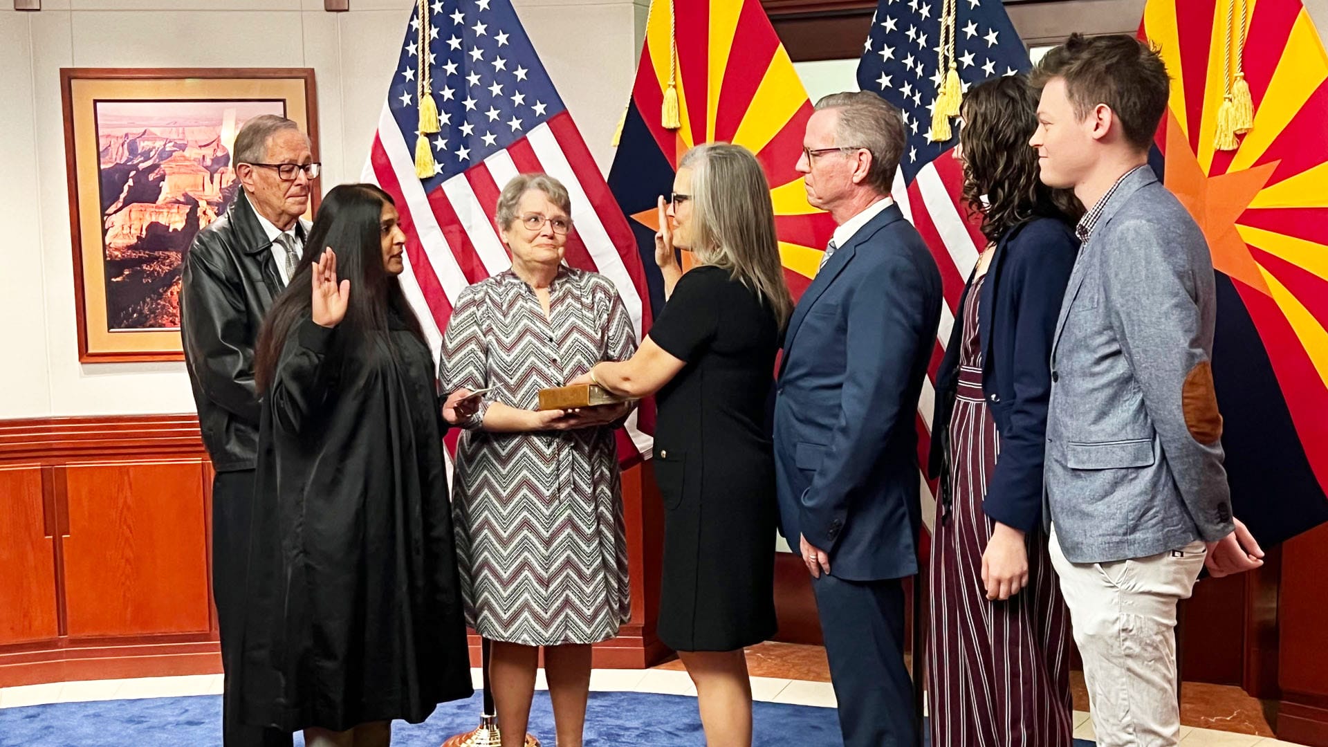 For Hobbs, the oath of office was administered by Roopali Desai, a recently confirmed judge of the 9th U.S. Circuit Court of Appeals who was previously represented Democrats in election cases and Hobbs as secretary of state.