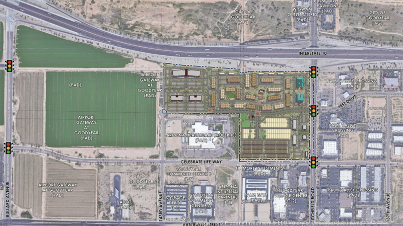 A 70-acre project is being proposed for a site with frontage along Interstate 10 called Goodyear Celebration Plaza. A conceptual site plan shows where offices, multifamily, a plaza and retail could be developed.