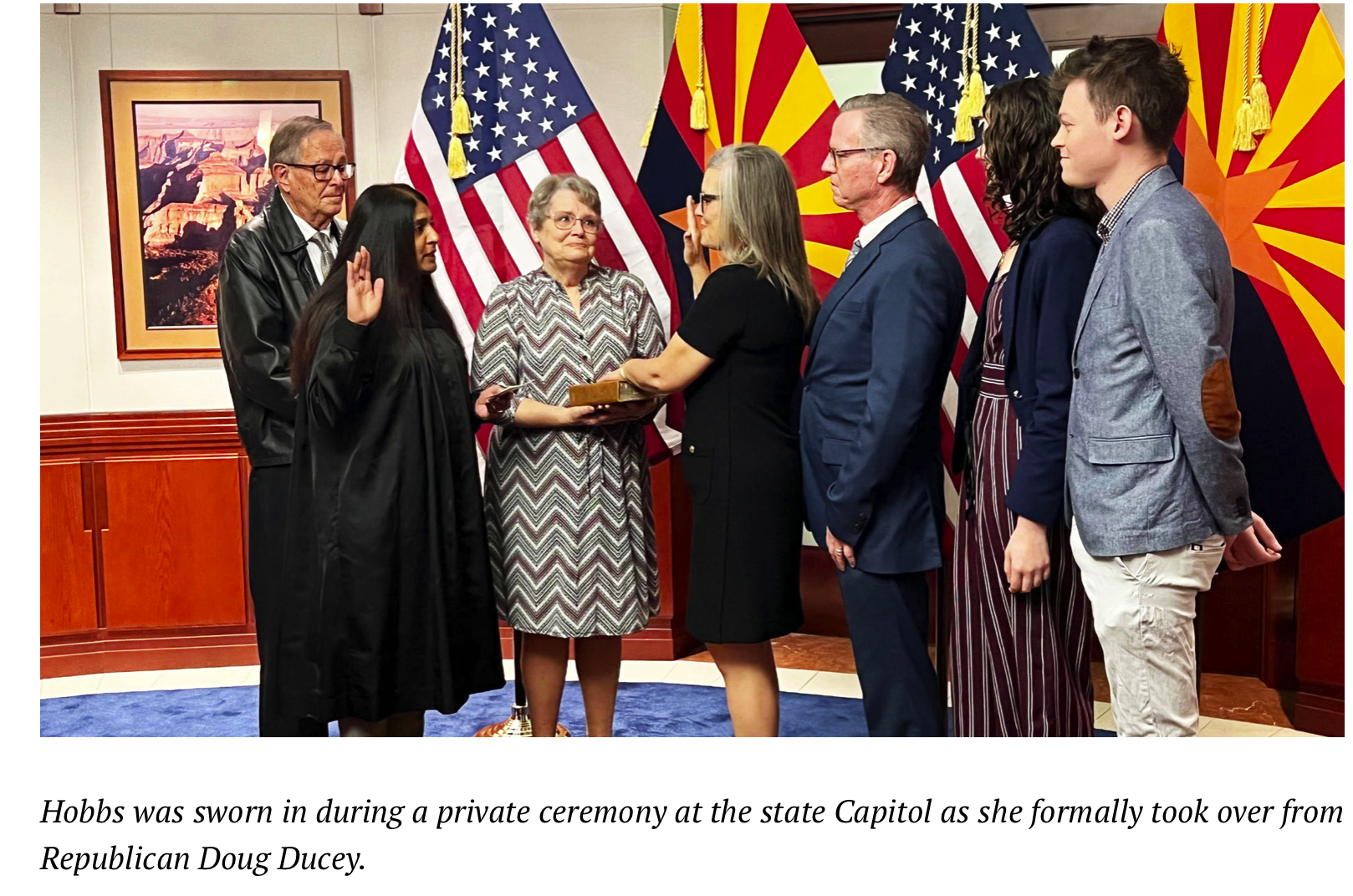 She took the oath of office on Tuesday in a private ceremony, along with newly elected Secretary of State Adrian Fontes, Attorney General Kris Mayes, Treasurer Kimberly Yee, state Superintendent of Public Instruction Tom Horne and state Mine Inspector Paul Marsh.