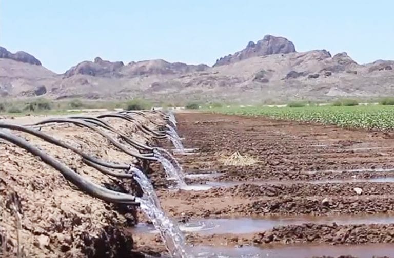 Water flows in 2017 to a Pinal County cotton farm at the base of the Sawtooth Mountains.|| Arizona Farm Bureau By Clara Migoya || Arizona