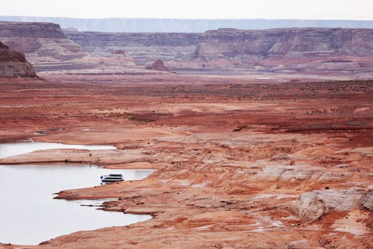 A wide photo of a dry, rocky landscape on the edge of a lake.. The shore of Lake Powell in Page, Ariz. Along with Lake Mead,