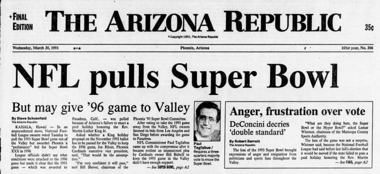 Good history lesson on #MLKDay: In 1990, the NFL did not stick to sports. It stripped Arizona of the ’93 #SuperBowl when the state’s citizens