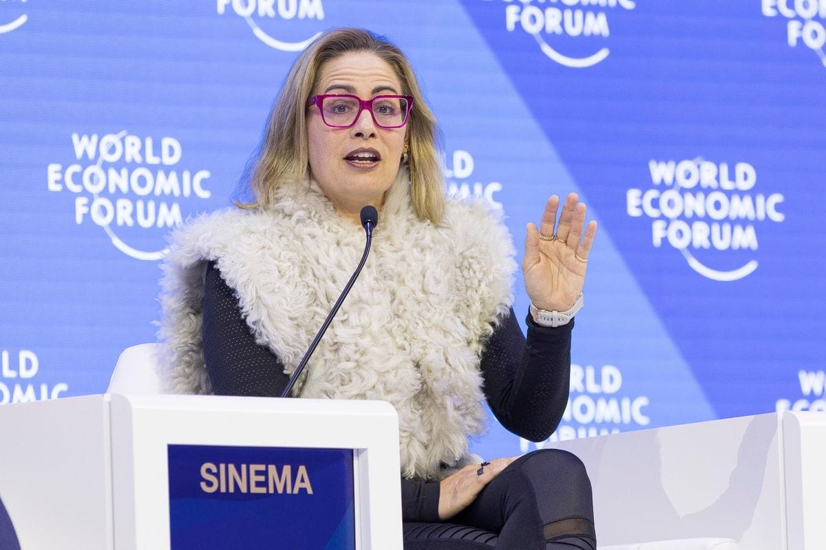 U.S. Sen. Kyrsten Sinema (I-Ariz.) speaks during a panel discussion at the World Economic Forum’s annual meeting in Davos, Switzerland on January 17, 2023. Photo || Benedikt von Loebell/World Economic Forum/flickr/cc