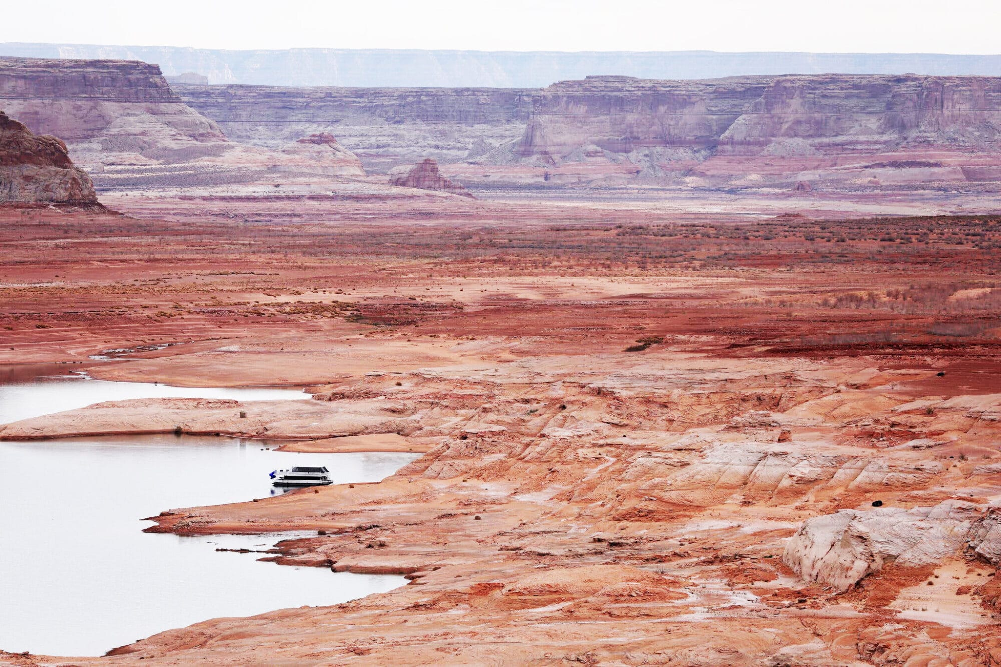 A wide photo of a dry, rocky landscape on the edge of a lake. A lone houseboat floats near the shore. The shore of Lake Powell in Page, Ariz. Along with Lake Mead, it provides water and electricity for Arizona, Nevada and Southern California.Credit || Justin Sullivan/Getty Images