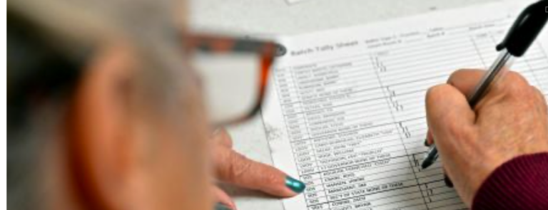 Volunteer Kathleen OConnor tallies votes during a training session for hand counting voters ballots at a Nye County government building in Pahrump, Nevada, on October