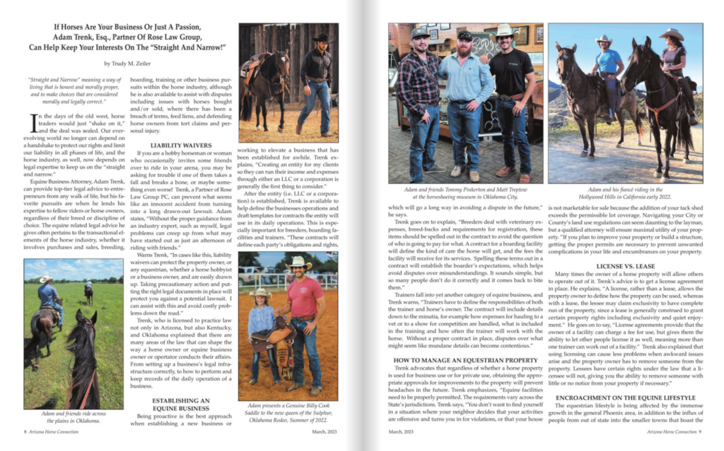 “If horses are your business, or just a passion, Adam Trenk, Esq., can keep your interests on the ‘straight and narrow.’” That’s how Arizona Horse Connection magazine kicks off its in-depth profile of Rose Law Group’s partner and director of equine law.