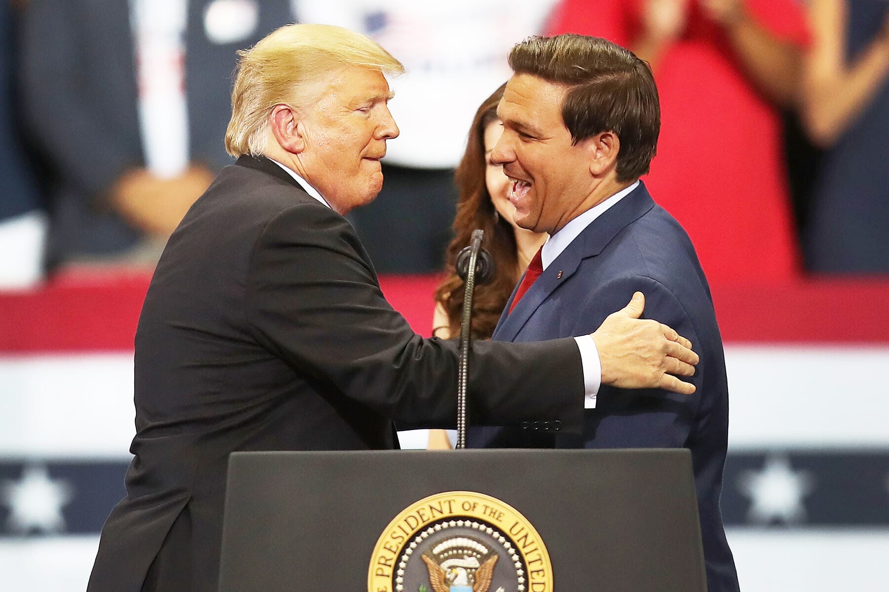 Then-President Donald Trump greets then-Florida Republican gubernatorial candidate Ron DeSantis during a campaign rally at the Hertz Arena on Oct. 31, 2018 in Estero, Fla. In 2024, the two candidates may run against one another for president.Joe Raedle/Getty Images