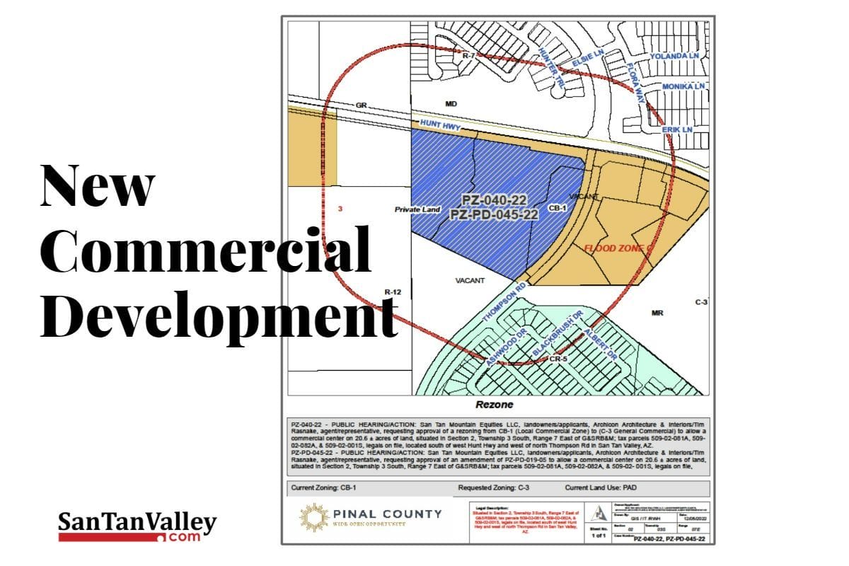 A proposal to allow a commercial center on a 20.6-acre plot of land in San Tan Valley, Arizona was heard at the Pinal County Board of Supervisors’ meeting on March 1, 2023. The meeting included arguments from both proponents and opponents of the project.