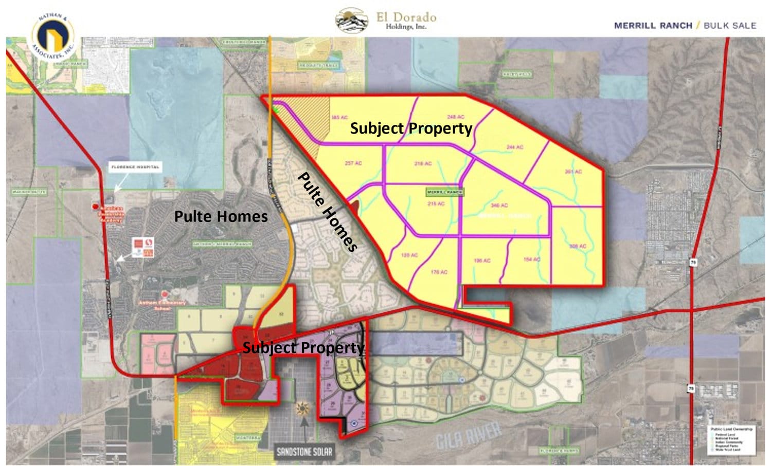 El Dorado plans to develop master-planned communities with 12,000 homes that will also include industrial, commercial and retail components. The acreage is non-contiguous, with one parcel of land east of Parkside at Anthem at Merrill Ranch by Pulte Homes on the other side of the railroad tracks with a bit touching on Felix Road. The second parcel is located south of Felix Road and Hunt Highway.