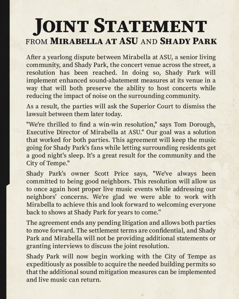 The dispute, which we have reported on in the past, involved the Mirabella at ASU senior living community and Shady Park, a popular concert venue. For months, senior residents at Mirabella at ASU complained of the loud music coming from Shady Park, which eventually led to quarreling and lawsuits.