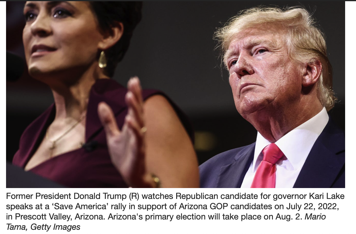 Former President Donald Trump (R) watches Republican candidate for governor Kari Lake speaks at a ‘Save America’ rally in support of Arizona GOP candidates on July 22, 2022, in Prescott Valley, Arizona. Arizona’s primary election will take place on Aug. 2.