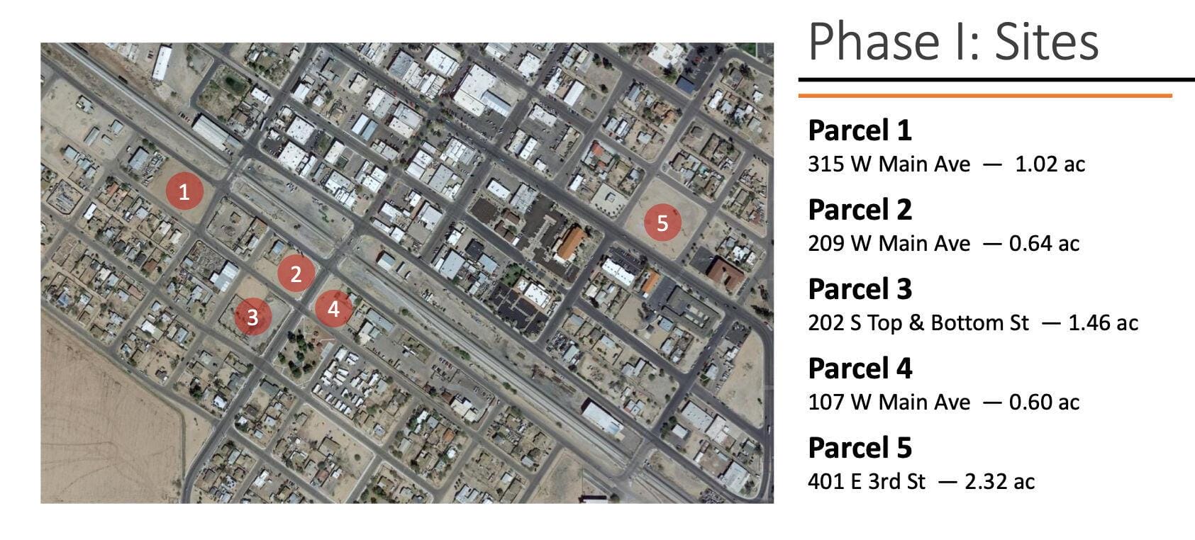 The project involves five parcels of land, mostly south of the Union Pacific Railroad on Main Avenue and Top and Bottom Street, and near downtown at 401 E. Third St.