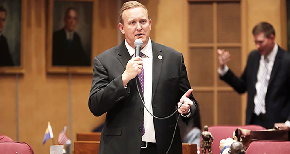 Sen. Steve Kaiser, R-Phoenix, speaks on the floor of the Arizona State Senate at the Arizona State Capitol building in Phoenix on March 13. He has revived a long battle at the Legislature this year to block League of Arizona Cities and Towns’ employees from receiving state benefits. || Gage Skidmore via Flickr