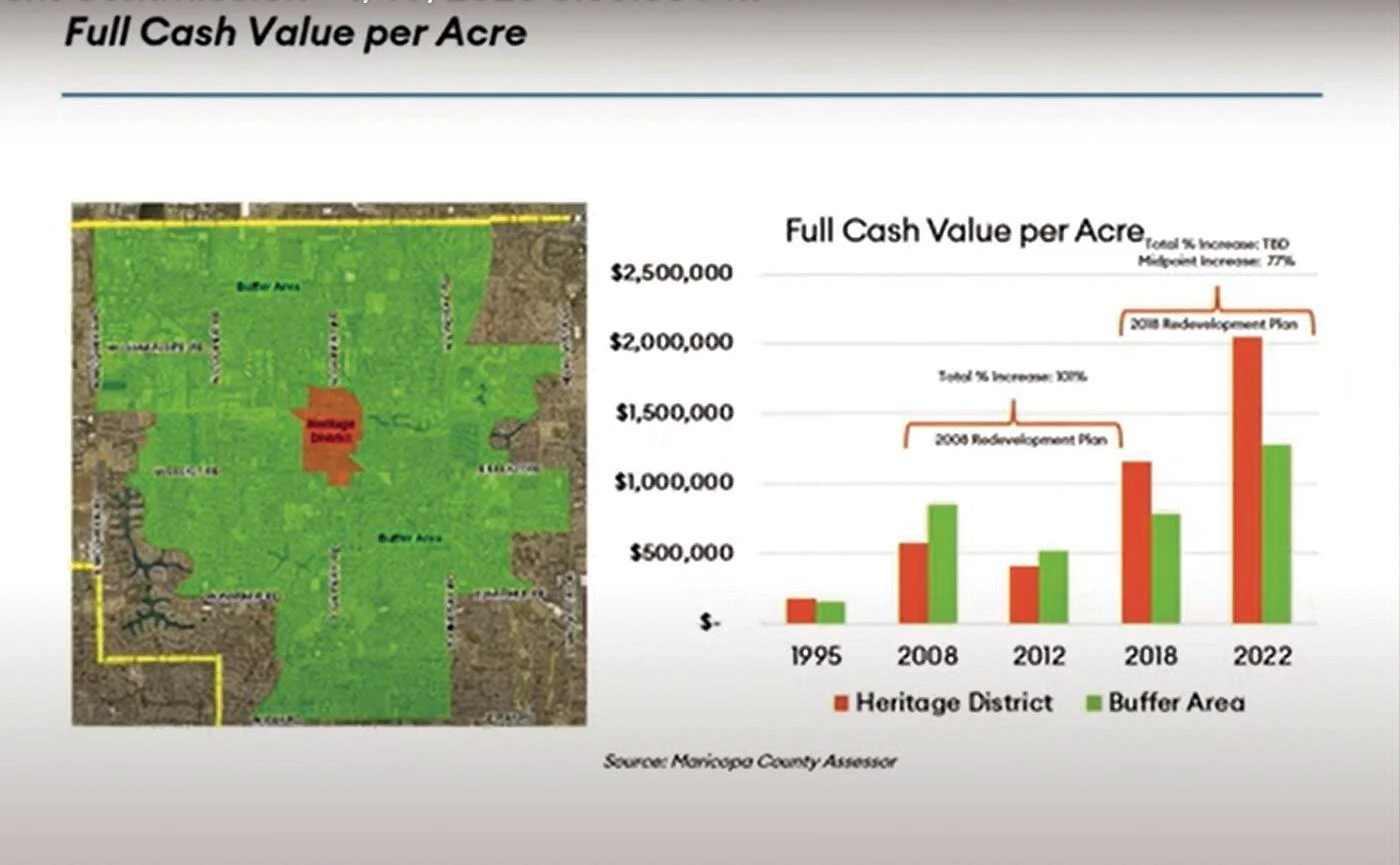 The Heritage District’s full cash value per acre increased 77% from 2018 to 2022, according to Price. It was just over $2 million an acre in 2022.