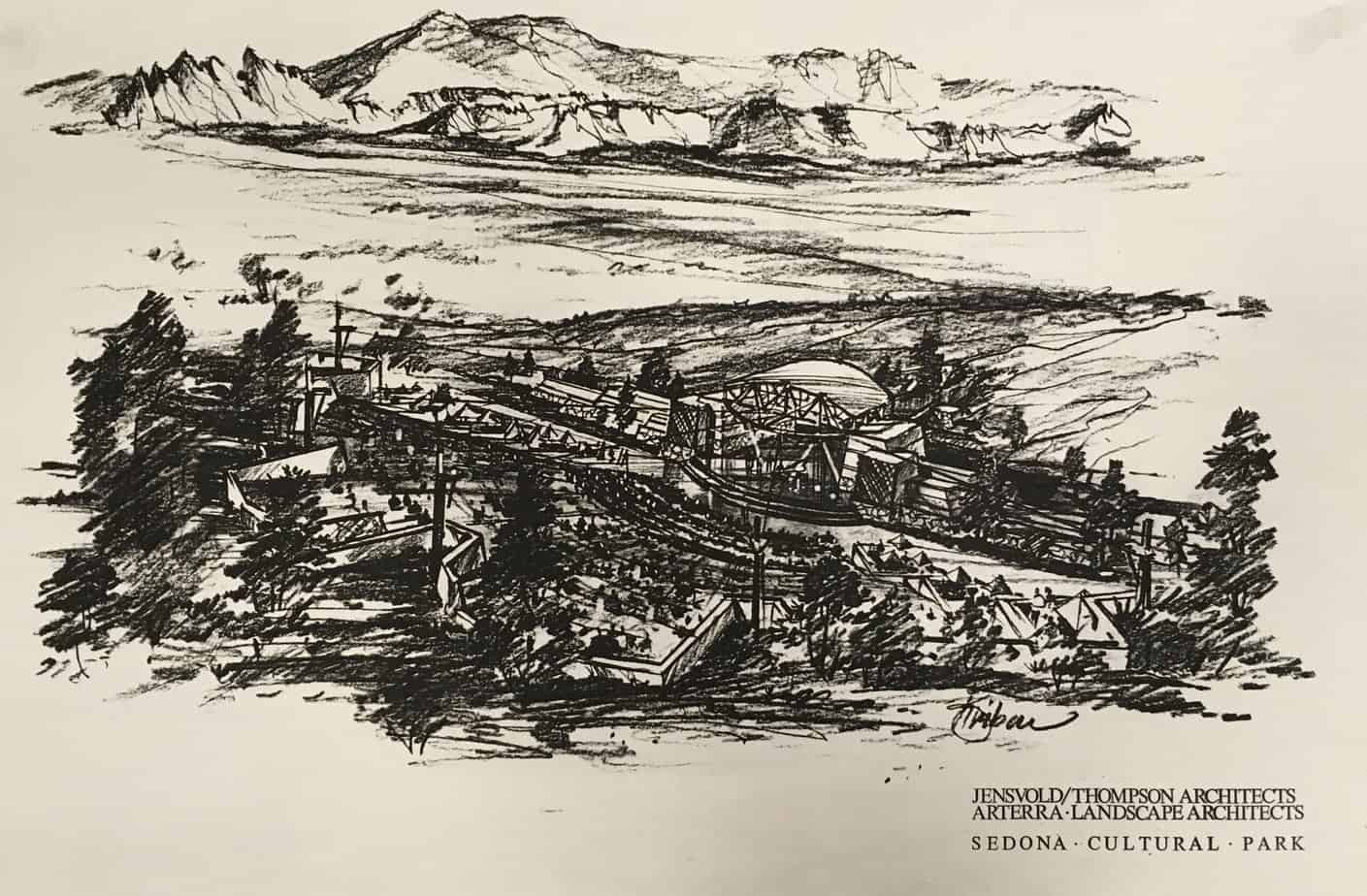 An early concept sketch for the Cultural Park’s amphitheater, showing a conventional stage house similar to that at Red Rocks in Denver, rather than the iconic triple arches that were selected for the final design. Photo courtesy Jensvold/Thompson Architects.