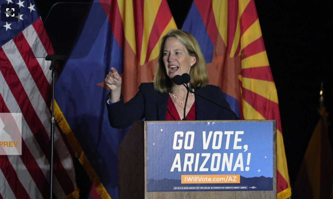 Capitol Media Services Kris Mayes, the Democratic nominee for attorney general, speaks at a Nov. 2 campaign rally in Phoenix. || Jerod MacDonald-Evoy/Arizona Mirror (2022)
