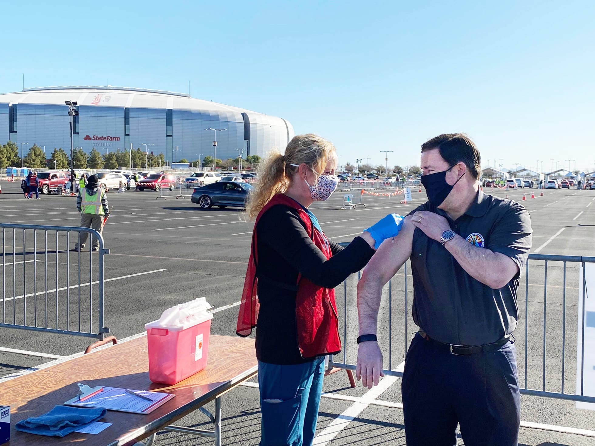 Former Arizona Gov. Doug Ducey, a Republican (here receiving COVID vaccine) provided financial incentives to families and school districts that rejected mask mandates during the pandemic. He widely was criticized for not implementing a statewide mask mandate and for not issuing a shelter-in-place order amid dire warnings about the looming crisis in Arizona hospitals in November 2020 and December 2020. || Governor’s Office